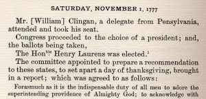 November 1, 1777 – The Continental Congress issued a National Thanksgiving Day Proclamation. Here is the proclamation: